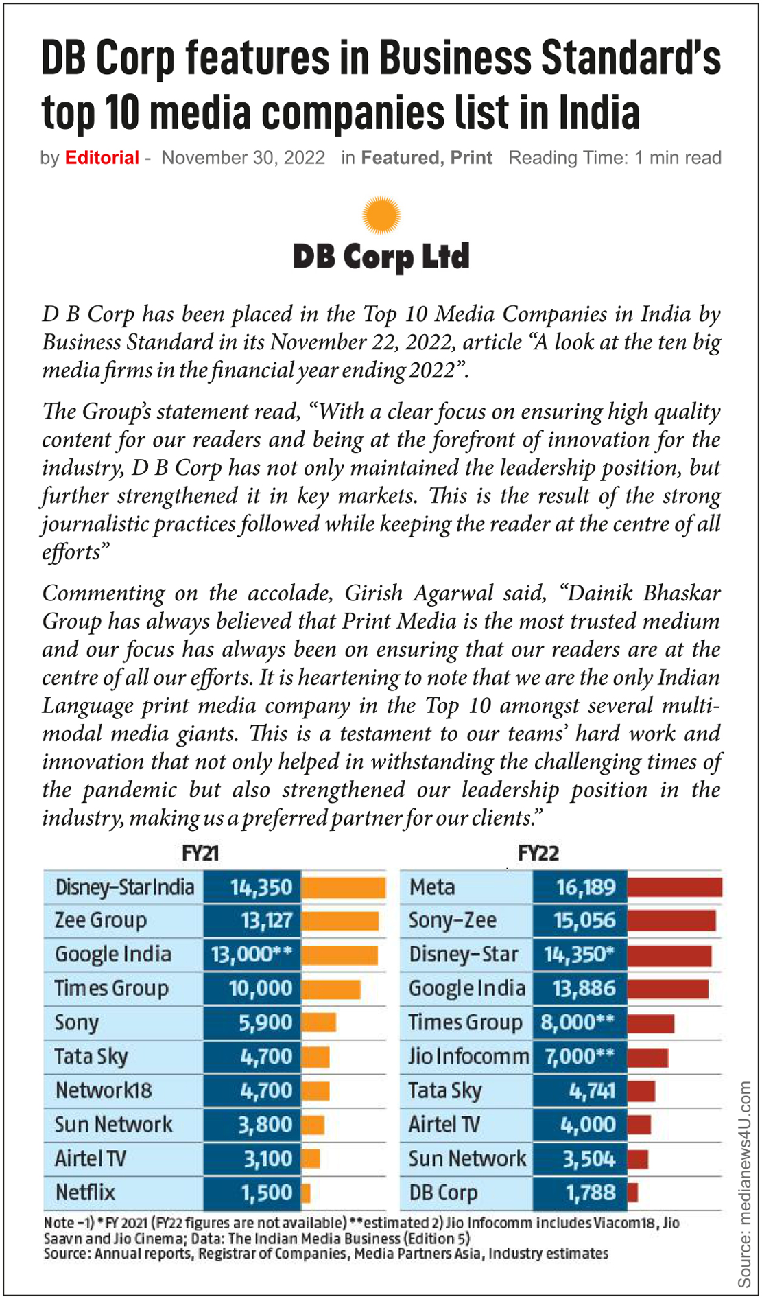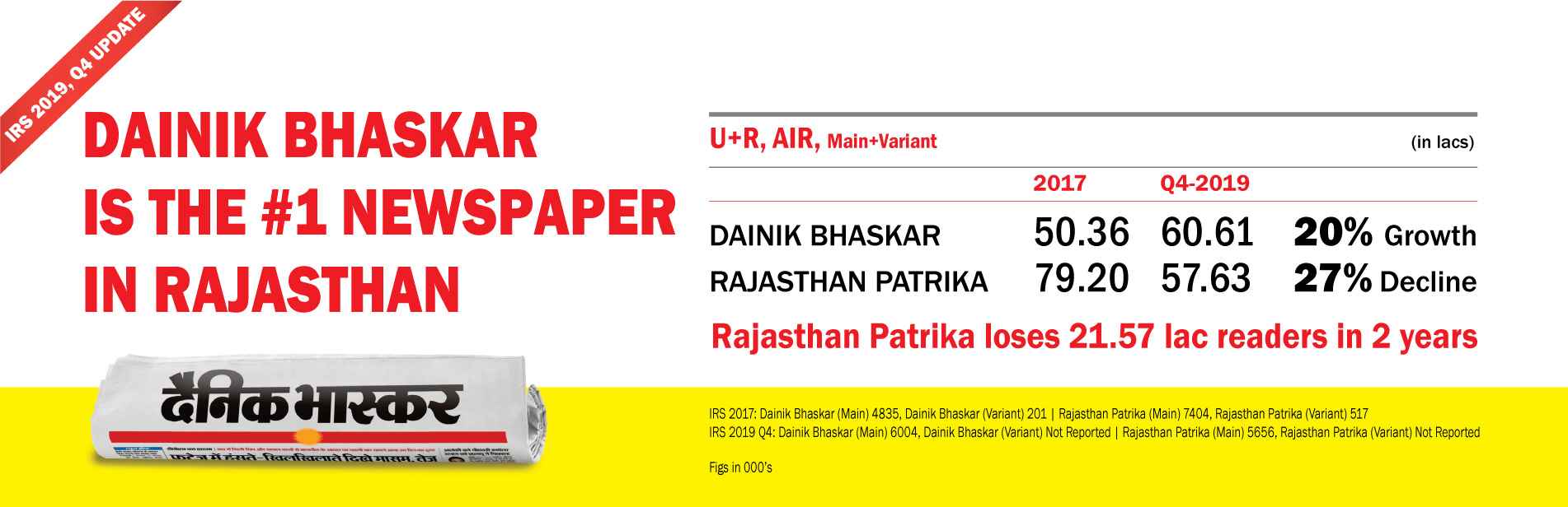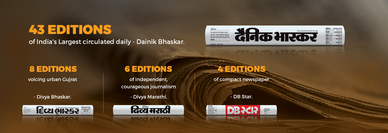 Dainik Bhaskar Group is Urban India's #1 newspaper group and has 5 newspapers with 61 editions. The group has a readership of 6.63 crores (Source: TR | IRS 19 Q4, M+V, U+R). The group has a strong presence in the radio business. 94.3 MY FM, the radio brand of the group is the largest radio network in India, with presence in 30 cities across 7 states. The digital arm of the group, DB Digital has 4 portals and 3 apps in Hindi, Gujarati and Marathi.